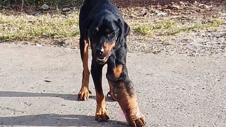 When rescuers first spotted Avocado, a gentle Rottweiler with soulful brown eyes and a spirit barely holding on, he was almost unrecognizable. He wandered aimlessly through the streets, ribs visible beneath his patchy coat, each step marked by a painful limp. His front paw was badly swollen—so much so that walking had become an act of sheer endurance. Many looked away, unable to bear the heartbreaking sight. But fate wasn’t finished with him yet.