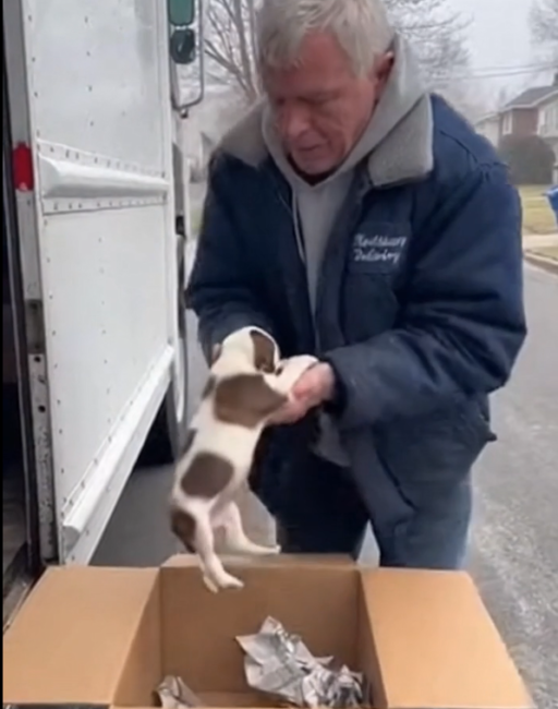 The delivery driver stood frozen in the middle of the road, one hand still clutching the box lid, the other instinctively holding the puppy so it wouldn’t fall. His breath came out in short, uneven bursts. He smelled faintly of cigarettes and stale coffee, the kind of scent that follows men who work long hours alone.