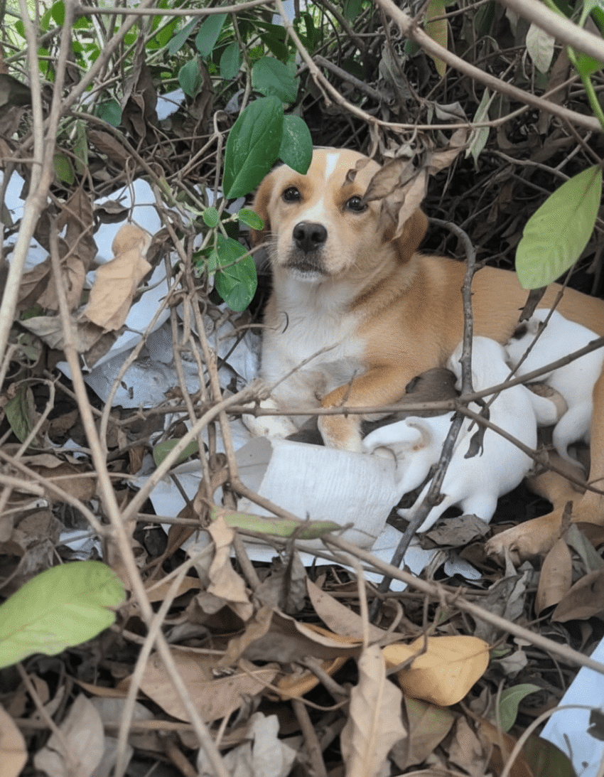 In the sweltering heat of a late afternoon in rural Thailand, beneath a tangled canopy of overgrown banana leaves and brittle palm fronds just outside the bustling outskirts of Chiang Mai, a heart-wrenching scene unfolded that would soon captivate thousands. A small, tan-and-white mother dog, her fur matted with mud and flecked with thorns, lay curled protectively around a wriggling cluster of newborn  puppies in what appeared to be nothing more than a haphazard nest of discarded plastic bags, withered branches, and soggy cardboard. Her wide, expressive eyes—glistening with what could only be described as tears—locked onto passing motorists with an intensity that pierced through the indifference of daily commutes. This wasn’t just any stray; this was a fighter, a desperate guardian whose silent vigil amid the encroaching jungle had gone unnoticed for days, until one man’s impulsive decision to pull over changed everything.