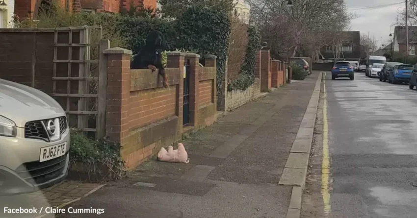 It’s not every day that a simple drive turns into a heartwarming moment of kindness, but that’s exactly what happened to Claire Cummings when she spotted something unusual on the sidewalk. As she was on her way to visit a friend, Cummings noticed a stuffed pig lying alone by the side of the road. At first glance, it seemed like a forgotten toy, but a second look in the rearview mirror revealed a different story — one that involved a determined dog and a little help from a stranger.