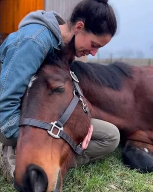 She dropped to her knees beside him without thinking about the mud soaking through her pants, without thinking about the weight of him or the risk. Her hands slid under his massive head as it hit the ground, cradling it instinctively, protectively.