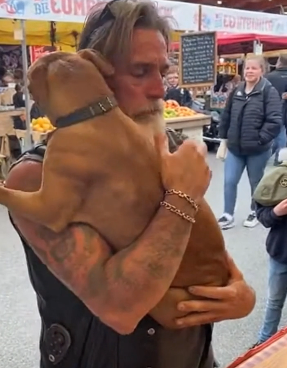 The biker placed the cash on the table — and before anyone could speak, the dog tore free from the rope and ran straight into his arms.