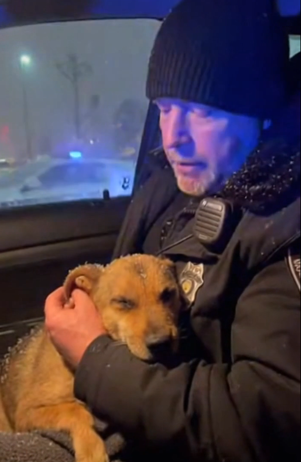 The dog stopped shaking the second the officer lifted it into the warm patrol car—and then it pressed its frozen head into his hand like it had finally found Christmas.