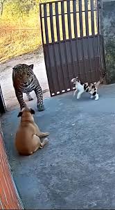 This is the part that makes no sense. This is the moment that defies all laws of nature. The cat, which is barely a snack for this jaguar, doesn’t run. It doesn’t hide. It charges forward, puffs up its fur, and stands its ground. It places its tiny body directly between its canine friend and the massive, spotted killer.
