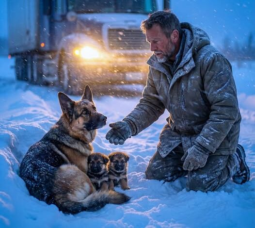 Driving home through the storm, headlights barely piercing the whiteout, Ethan noticed a dark shape near a dangerous curve in the road. Instinct overrode caution. He stopped, stepped into the brutal cold, and discovered a German Shepherd curled protectively around two newborn puppies, half buried in snow. The dog’s body shook violently, her strength nearly gone, but her eyes stayed alert, fierce with determination.