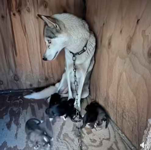 The chain was more than physical—it was a symbol of a life trapped in oblivion. No one came near. No one asked. No one seemed to notice that in that filthy, hidden corner, a mother was fighting to keep her children alive. Her body was scarred, her skin cracked from malnutrition, her eyes dull with fatigue. Yet every time one of her puppies cried, she moved, licked them, and protected them with what little strength she had left.
