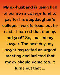 My ex-husband is using half of our son’s college fund to pay for his stepdaughter’s college. I was furious, but he said, “I earned that money, not you!” So, I called my lawyer. The next day, my lawyer requested an urgent meeting and insisted that my ex should come too.