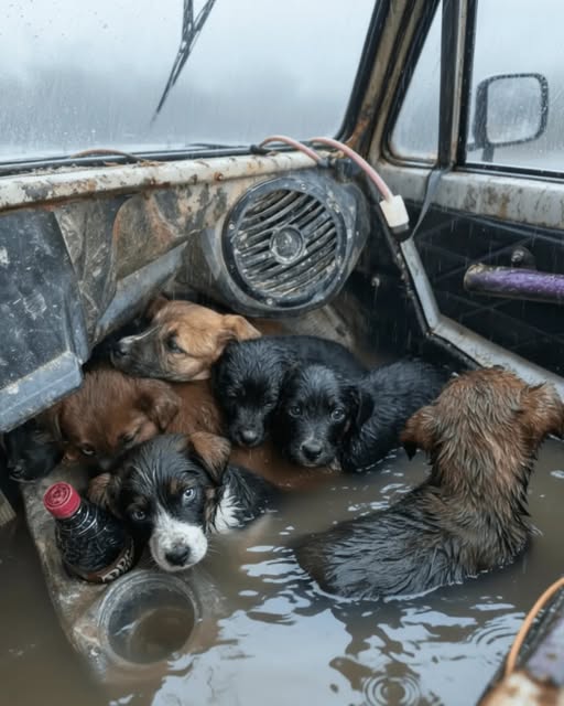 Inside the car, eight puppies huddled together, shivering in the cold, with their ribs protruding from their underfed bodies. The floodwaters had seeped into the rusted floorboards, reaching six inches high, yet the puppies pressed together, seeking warmth in the car’s damp interior.