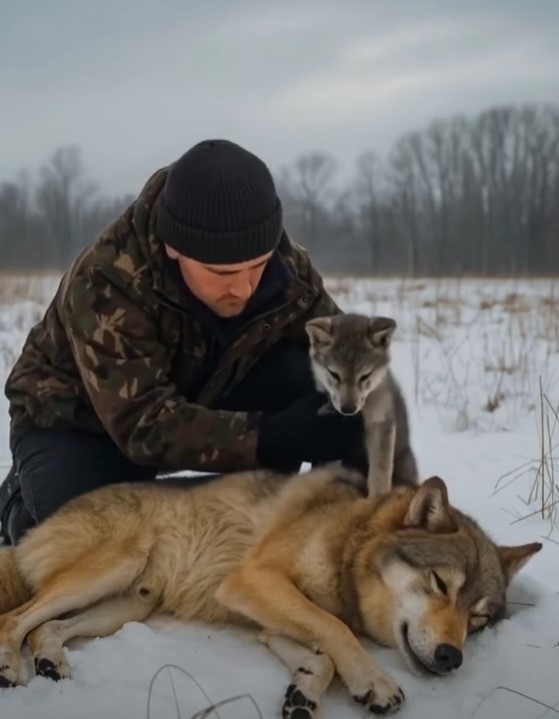 He stepped back instinctively—but then he saw her pup circling, whining, rubbing against its mother. The she-wolf was breathing unevenly, likely caught in a trap.