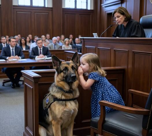 A collective exhale rippled through the gallery as the massive German Shepherd entered. Majestic and calm, his amber eyes scanned the room with alert serenity. He wore an official police-issued therapy vest, a symbol of a new program designed to comfort young victims. As Lily froze, overwhelmed by the towering mahogany benches and the imposing presence of the judge, she locked eyes with Shadow. The dog sat perfectly still on the rug before the witness chair, his head tilted in a quiet, canine invitation.