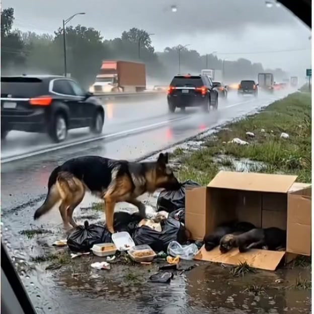 On a cold, rainy day beside a busy highway, a German Shepherd named Bella stood guard over a cardboard box hidden among trash. Inside were her puppies, huddled together for warmth while cars rushed past. Starving and exhausted, Bella scavenged for food, always bringing what little she found back to her babies. Her ribs showed, but her resolve never wavered. In a world that had abandoned her, she refused to abandon them.