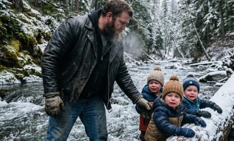He didn’t hesitate. He swung his leg off the bike and plunged toward the steep embankment leading down to a swollen, icy creek. Below him, tangled against a fallen log like discarded debris, were three small shapes. They were children—tiny, soaked, and barely clinging to life. A three-year-old boy gripped the log with raw, red fingers; a girl huddled beside him with blue lips and glassy eyes; and a toddler lay nearly unconscious, her head lolling with every shallow breath.