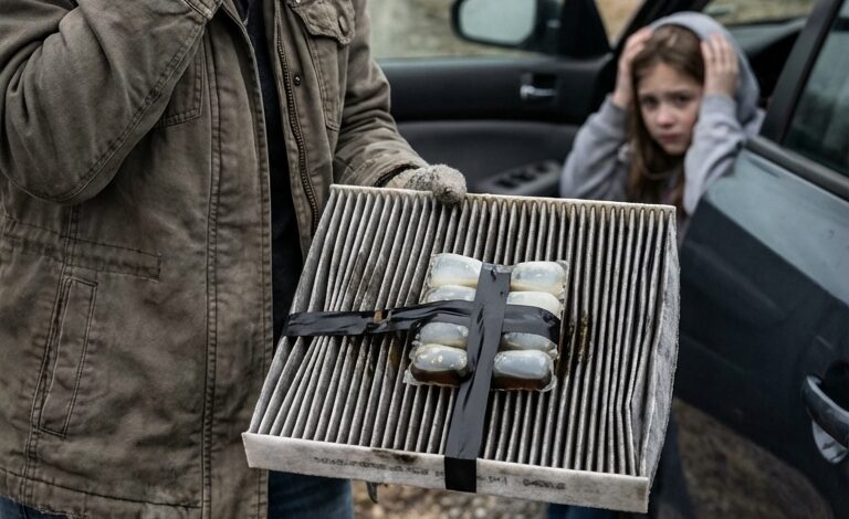 I pulled Emma into the grass, kneeling beside her until her breathing eased. The smell lingered in my nose like a warning. I forced myself back to the car, flipping open the glove box, ripping out the panel covering the cabin filter.