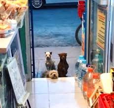 Every morning, these abandoned dogs come to the door of this small store, patiently waiting for it to open. They know that someone inside has a heart big enough to care for them.