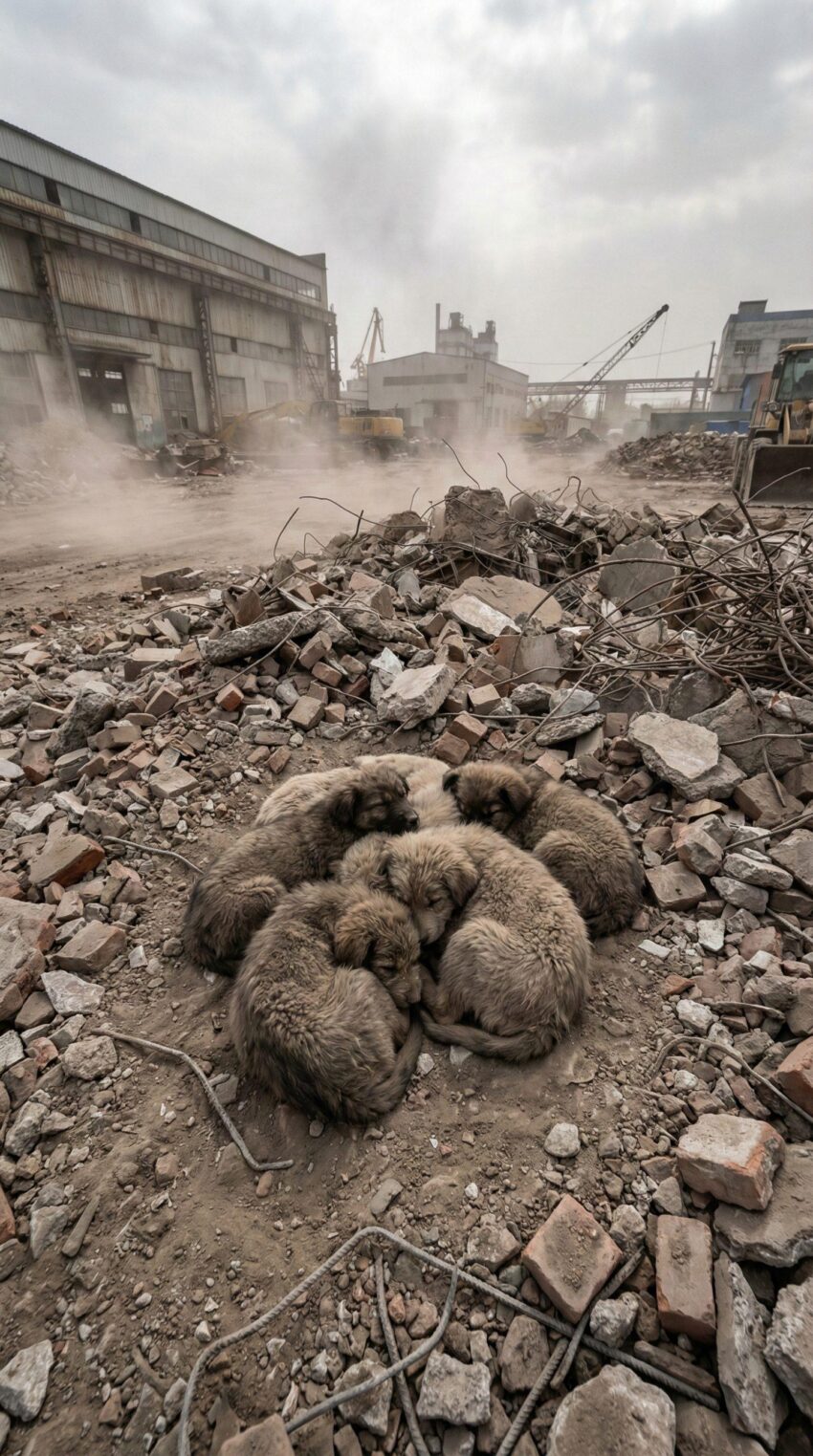 It began with a single, haunting photograph that spread like wildfire across social media in early 2025: a cluster of six tiny, dust-covered  puppies curled into a tight ball atop a mountain of jagged rubble and twisted rebar. The industrial wasteland around them—crumbling factory walls, skeletal cranes frozen mid-swing, bulldozers idling like sleeping giants—looked like the aftermath of an apocalypse. Their fur, matted gray-brown with concrete powder, blended so perfectly with the debris that they seemed almost camouflaged, as if the earth itself had tried to swallow them whole. The image stopped scrollers in their tracks. How had these fragile creatures ended up here? And how were they still breathing?
