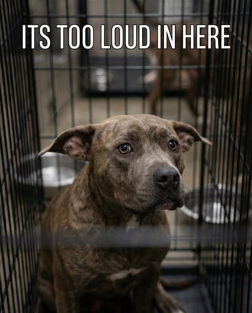 In a municipal shelter on the outskirts of a busy port city, surrounded by the constant metallic clatter of cages, barking dogs, slamming doors, and echoing footsteps, one dog did not make a sound. He sat rigidly inside a wire crate, ears tilted outward like broken antennas, eyes wide and wet, absorbing the chaos without reacting. Someone had taped a piece of paper above his kennel in block letters: ITS TOO LOUD IN HERE.