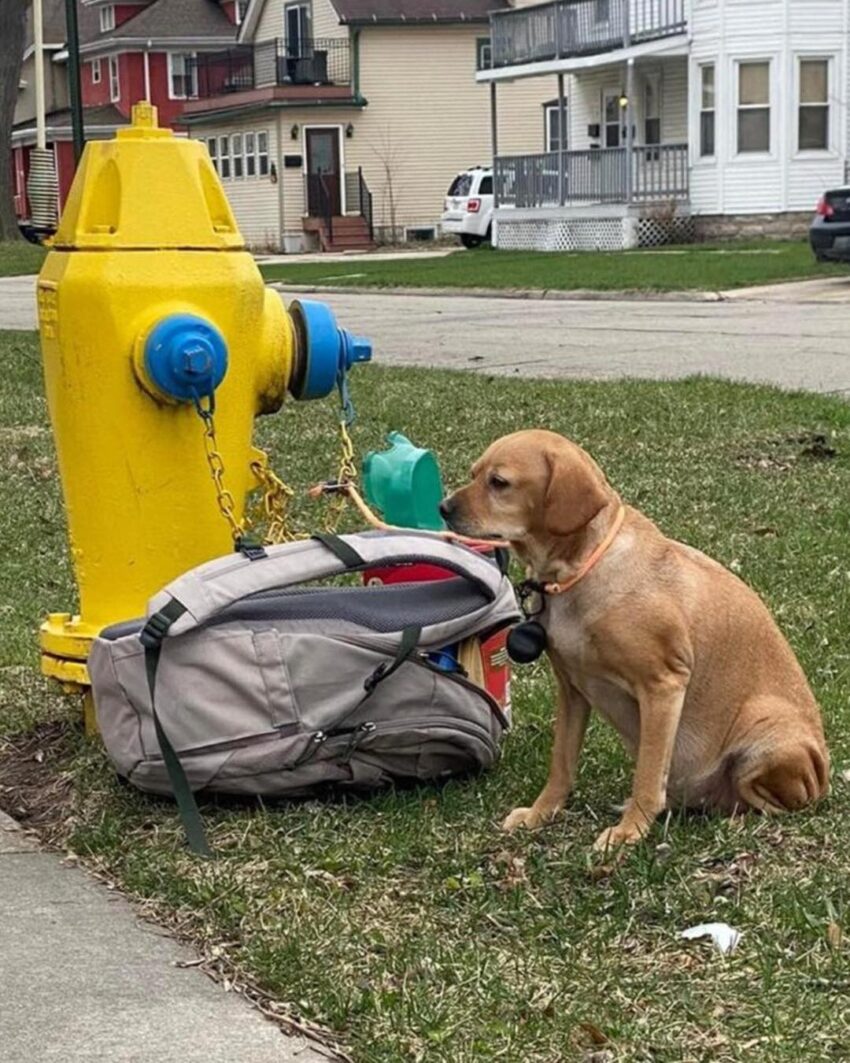 On an ordinary day in Green Bay, Wisconsin, a passerby noticed a quiet, mixed-breed dog tied to a fire hydrant with a large backpack beside her. The dog waited patiently, watching the street — as if hoping someone would return. The woman who found her stayed for nearly an hour, hoping the same. But no one came.