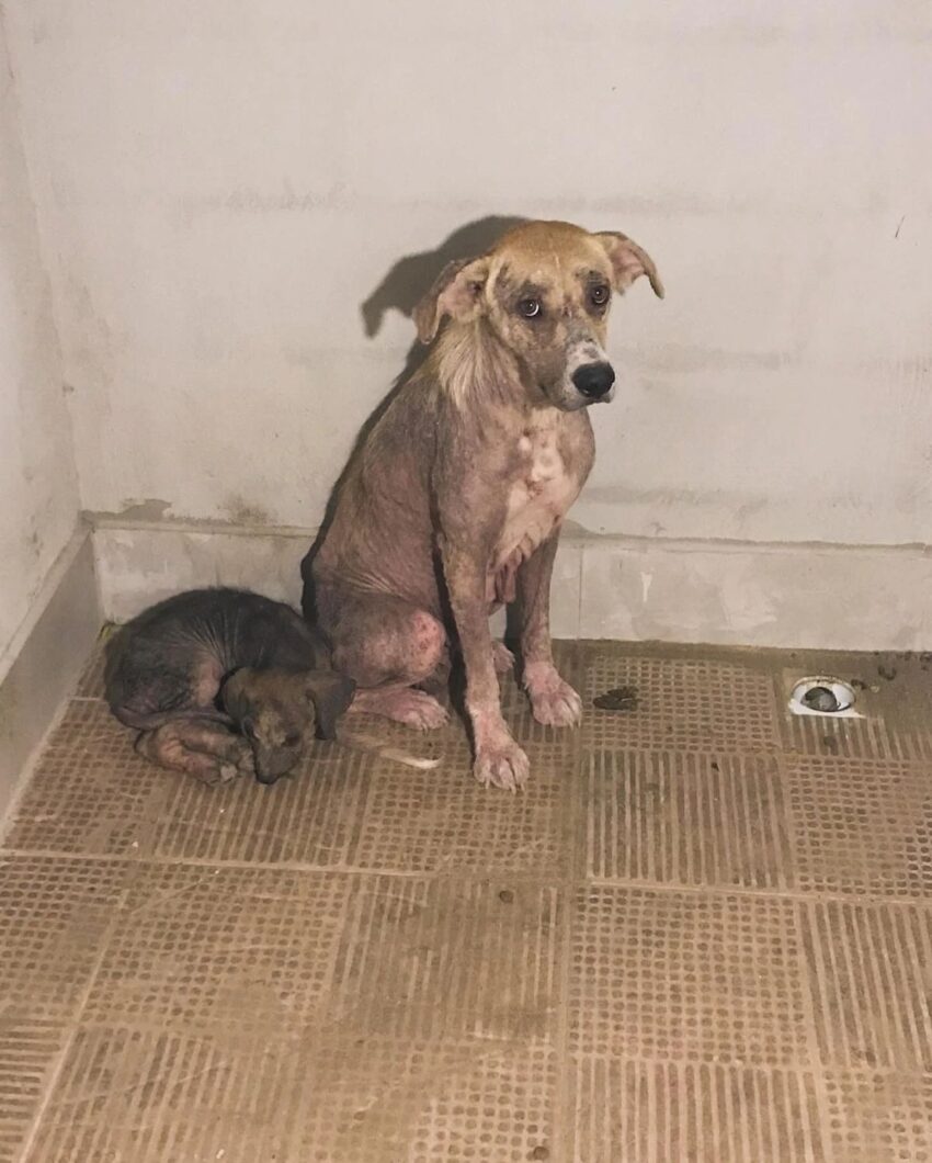 In a cold, bare corner, a mother dog curls up with her puppy. Their frail bodies tell a story of illness, hunger, and abandonment. Thin limbs, hollow eyes—but above all, a presence: the mother, upright despite the pain. Her eyes are heavy with fear and exhaustion, but also with fierce determination—to protect.