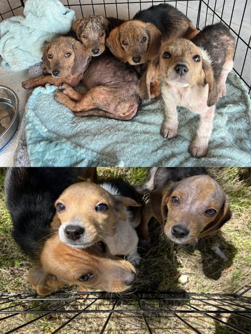 Upon arrival at Triangle Beagle Rescue, the puppies were in delicate condition. Their fur was missing due to excessive scratching, leaving their skin sore and irritated. They required medicated baths and gentle treatment to aid their recovery.