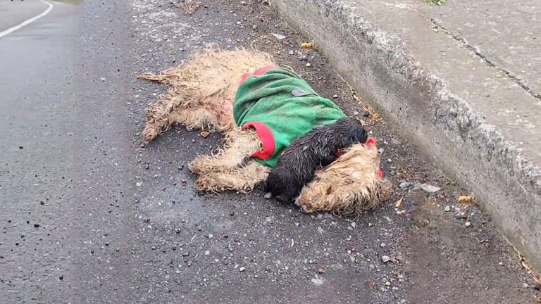 For many long minutes, nothing changed. The rain continued to fall, matting the dog’s fur against her trembling body. The puppy, too young to understand what had happened, stayed close, refusing to leave her side. In that bleak moment, the world seemed indifferent. Yet compassion has a way of appearing when it is needed most.