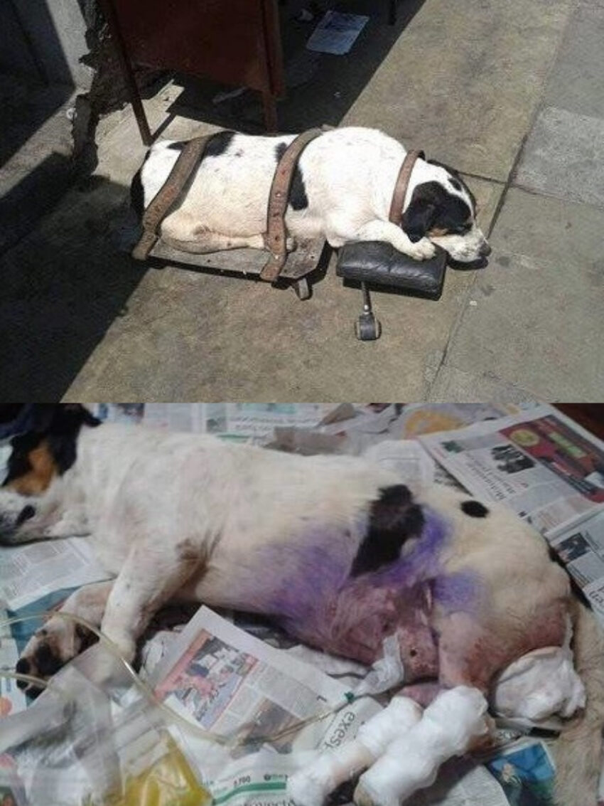 A veterinary examination revealed the full extent of his suffering: severe spinal trauma, kidney failure, numerous open sores, and serious injury from being tied down and forced to relieve himself in place.