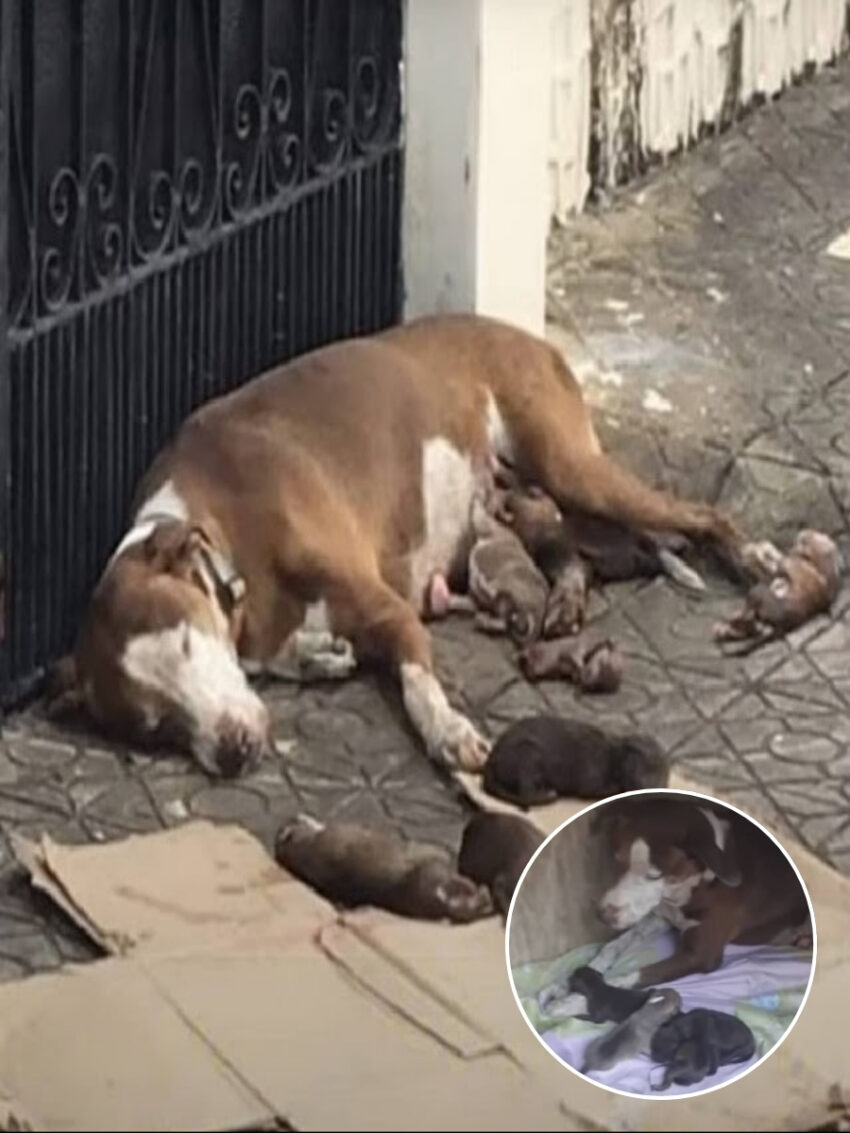 A pregnant dog, left behind by her owner and forced to give birth on the street, was rescued just in time along with her surviving puppies, thanks to the kindness of a stranger.