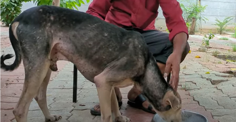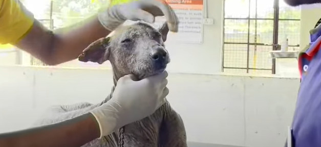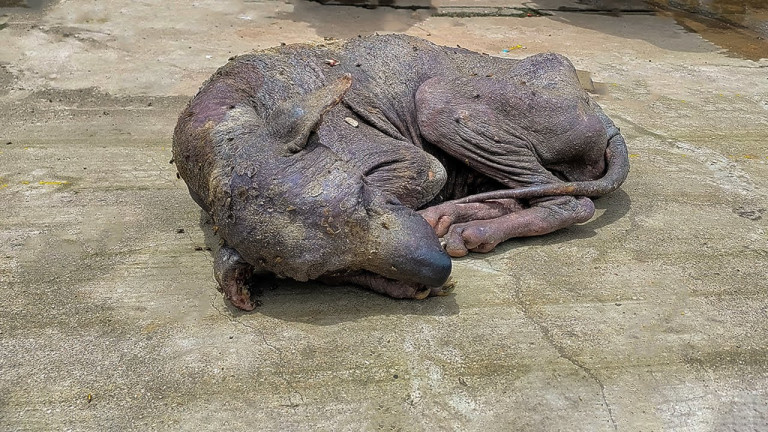 His body was covered in raw, inflamed patches, his fur nearly gone, and his skin riddled with sores from a serious skin condition.