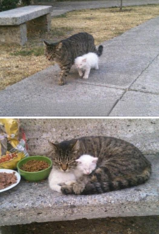 In the park in my neighborhood there is a [st.ray] tomcat who adopted a bl.ind kitten and guides him everywhere as if he were his protective shadow 😭🐾