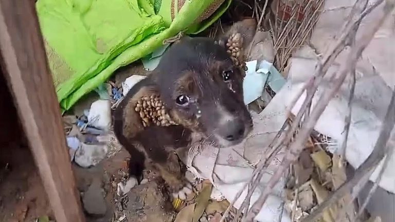 An orphaned puppy lay trembling beneath the weight of a massive parasitic infestation, his tiny body overwhelmed by thousands of ticks and fleas that clung to him relentlessly. When rescuers first brought him in, the little survivor—affectionately nicknamed “Ticky Ticky”—was barely holding on. He was severely malnourished, dangerously weak, and so drained of blood that his gums had faded to a ghostly white. Every inch of his fragile frame told the story of neglect and isolation.