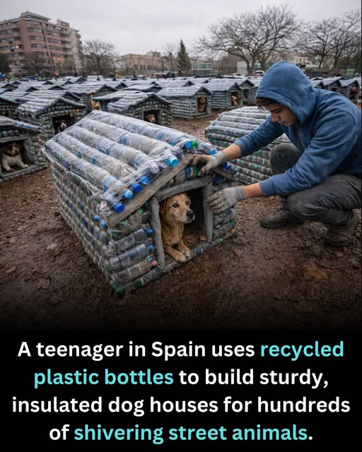 In a neighborhood in Spain, a teenage boy looked at piles of discarded plastic bottles and saw possibility instead of waste. As winter temperatures dropped, he noticed stray dogs curling up against walls and under benches to escape the cold.