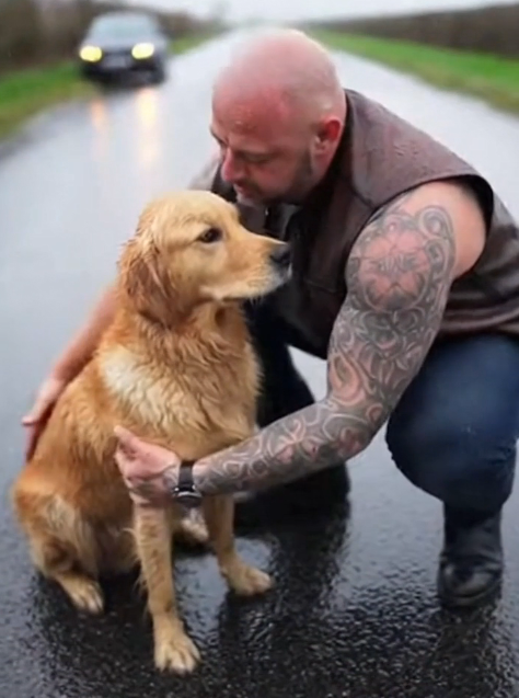 The biker slipped his arms beneath the dog and lifted him carefully against his chest. The retriever let out a soft, broken breath—not pain exactly. Something deeper. Exhaustion.