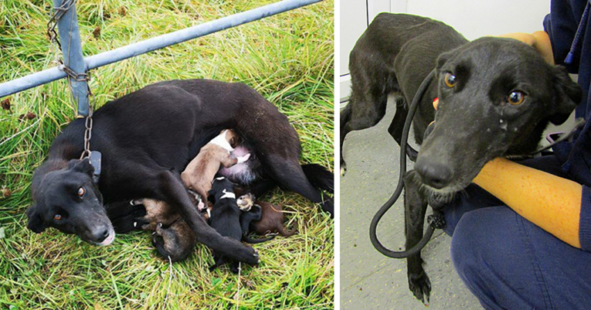 In the quiet stretch of a remote field, rescuers stumbled upon a scene that stopped them in their tracks—a young two-year-old lurcher, her body frail yet determined, [ch.ain.ed] tightly to a metal fence post. Curled at her feet were her six newborn puppies, still blind to the world and far too young to fend for themselves. They had no food, no water, and no protection beyond the courage of their mother.