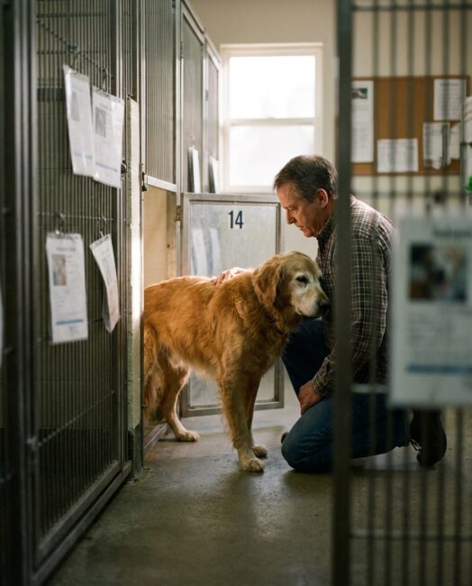The old golden retriever lay quietly at the front of his kennel, his gray muzzle resting on the metal threshold, watching every pair of shoes that passed the shelter hallway.