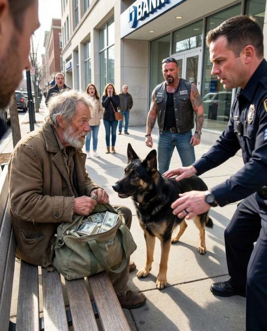 The German Shepherd lunged at anyone who came near the old man’s bag outside the bank, as if it was guarding something dangerous—but why had the man been sitting there for three days straight?