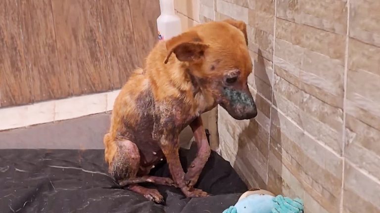 Her physical condition reflected the depth of her suffering. Large patches of her fur were gone, leaving her skin exposed, inflamed, and painfully irritated. She was so weak that even basic bodily control had become a struggle. It was clear she had endured prolonged hardship without proper care, nourishment, or safety. For anyone who has ever loved a dog, seeing her in that state would have been almost unbearable. Yet beneath the fear and frailty, there was still life in her eyes. There was still hope waiting to be uncovered.