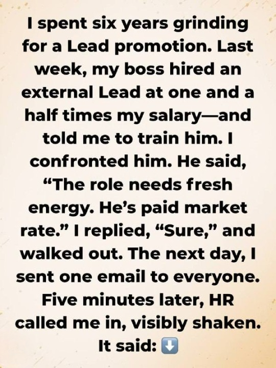 After six years of working toward a Lead position, she was passed over once again—this time for an external hire earning 1.5 times her salary. To make matters worse, she was asked to train him.