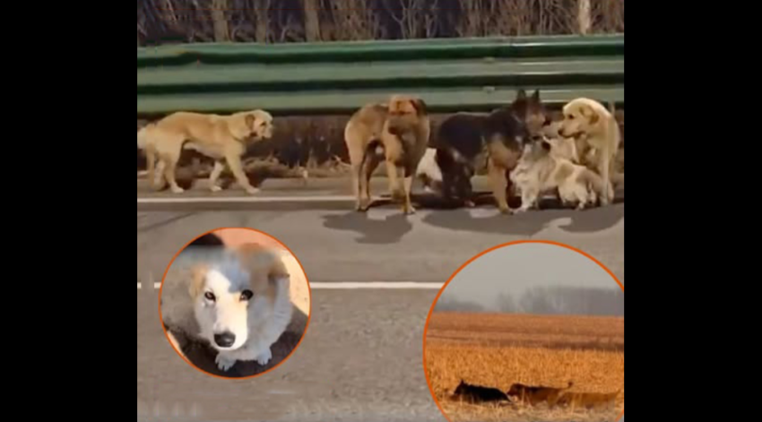 Near a highway, in Changchun, China. locals spotted seven dogs of different breeds—German Shepherd, Golden Retriever, Corgi, and others—moving together as a group, looking [fr.igh.ten.ed and di.sor.ien.ted].