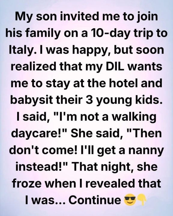 When I revealed this, my daughter-in-law froze, and my son tried to pressure me to help with the kids. I stayed calm, said nothing, and walked away. Now, I’m set on enjoying Italy for myself, keeping my distance, and showing that I’m more than just a grandmother—I deserve rest, fun, and independence.