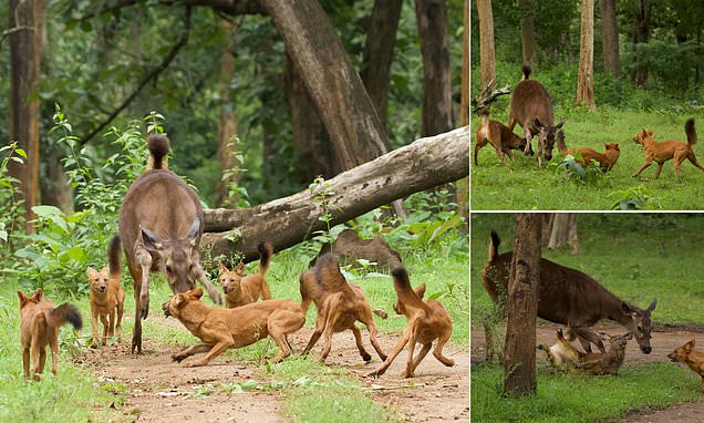 Kumar, the photographer, said: ‘Whilst the Sambar fawn didn’t survive, the mother tried all she could but the wild dogs were tenacious.