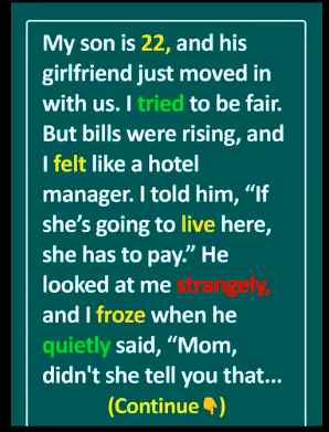 I told him, “If she’s going to live here, she needs to pay something.” He looked at me strangely. Then he quietly said, “No, Mom… Didn’t she tell you that she is pregnant? So, it’s you who needs to figure things out.”
