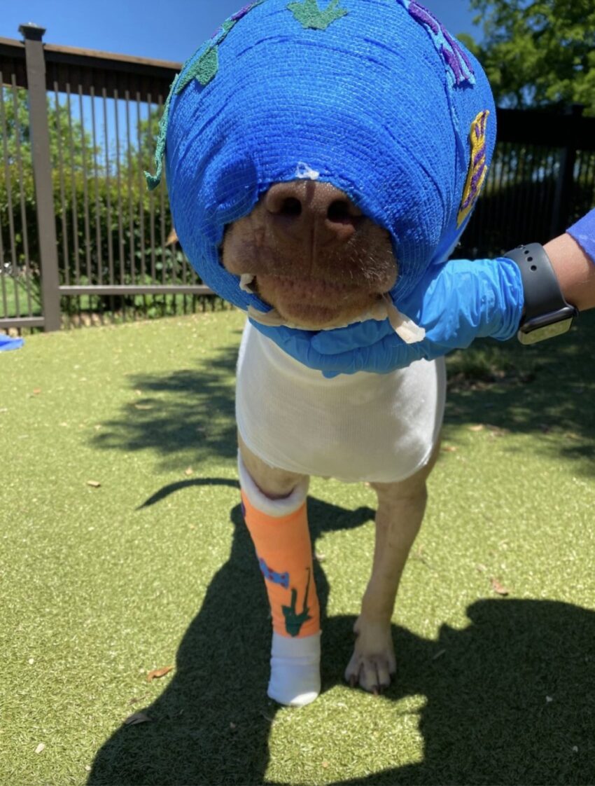 Buddy was put in the care of Tunica Humane Society, in Mississippi, and received medical treatments from the Mississippi State University’s College of Veterinary Medicine. In their care, Buddy began a slow but hopeful road to recovery.