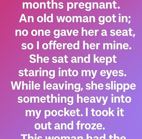 I was on the bus, seven months pregnant, caught between excitement and pure exhaustion. When an elderly woman got on, I immediately stood up and offered her my seat. She smiled gratefully and sat down, occasionally glancing at me—not strangely, but as if something about me felt familiar to her.I smiled back, glad that such a small gesture could make someone’s day a bit easier. As her stop approached, she rose slowly, holding onto the rail for support. Just before stepping off, she quietly slipped something into my coat pocket without saying a word.