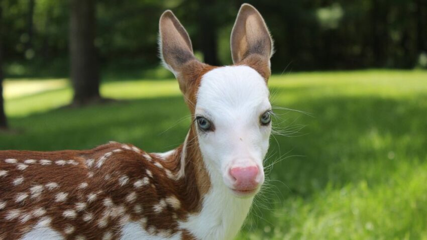 The one and a half-week-old fawn was born with a very rare condition called piebald. Unlikely [alb.inism or melanism], piebald occurs when an animal has large patches on its body without [pigme.ntation].