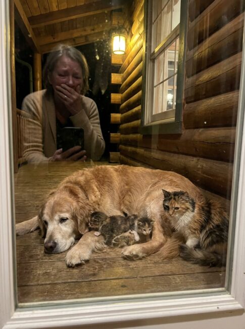 The calico paused, looked up at him, then at the kittens, and I swear she seemed to wait for his approval.