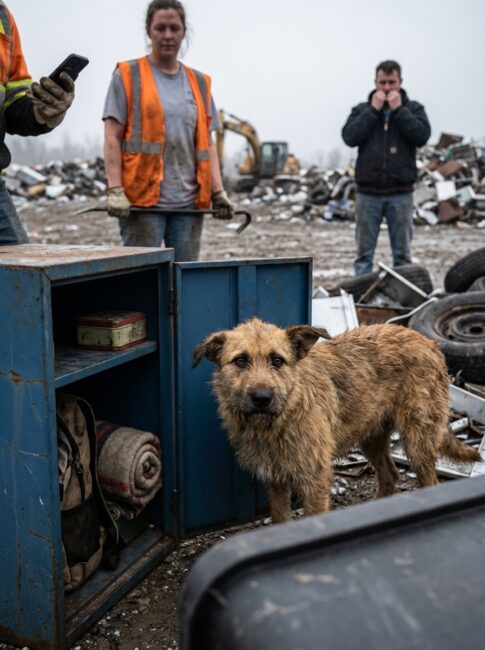 The ragged dog at our county dump kept throwing himself in front of a rusted steel locker like his life depended on it, and when my foreman finally told me to pry it open, the first thing I saw made my stomach drop.