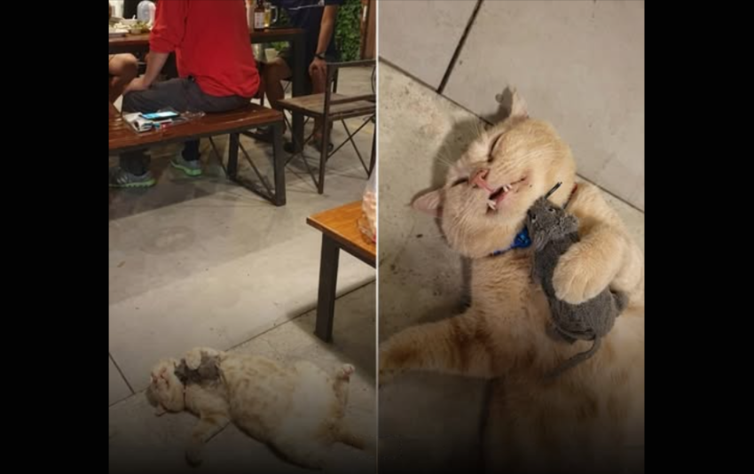 Within moments, customers start offering him food. Pieces of grilled chicken, bits of fish, snacks from their plates. Bobby doesn’t rush or panic like a stray would. He calmly accepts the offerings, lets out a soft, satisfied meow, and eats like he knew this would happen all along.
