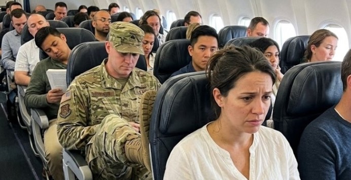 Other passengers began exchanging looks, silently questioning the situation. Why would someone in uniform behave in a way that disturbed another passenger, particularly someone who appeared to need extra comfort?