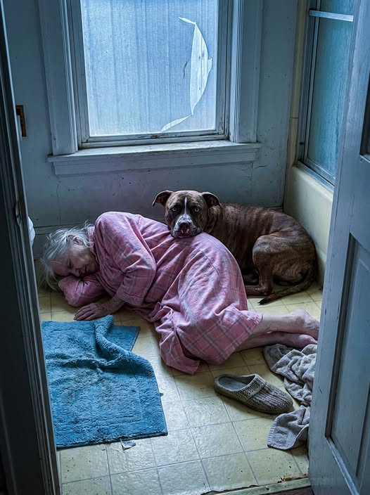 He looked at her on the floor. He whined — low, confused, like he was asking a question. Then he walked to her, slow, and lay down alongside her body, his back pressed against her ribs, his head against her shoulder. Seventy pounds of warm dog.