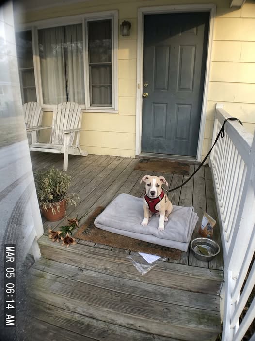 The puppy was still there, sitting on the fleece blanket. A leash was clipped to the porch railing. A bowl of fresh water was next to him. A sheet of paper in a plastic sleeve was tucked under the mat.