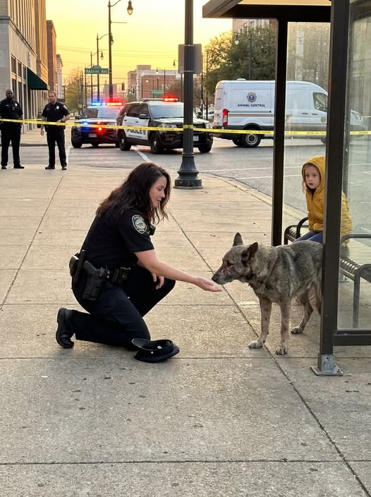 Officer Davila came up behind me, slow, in a low crouch. She had taken off her hat. She had taken off her duty belt — I learned later this was unusual; she did it on instinct. She knelt down beside me. She held out her hand to the dog. Open palm. Down.